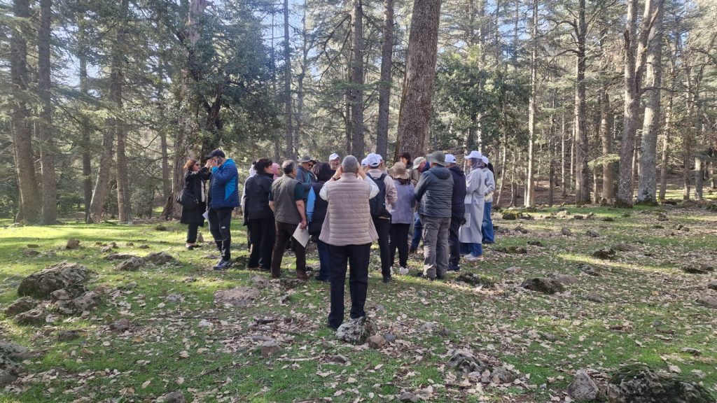 Quatrième arrêt : la parcelle 96 sur la route de Michlifen, vitrine de la régénération du cèdre. « C’était autour du cèdre, la régénération du cèdre et les défis de la régénération du cèdre et aussi la biodiversité au niveau du cèdre », souligne le président de l’AFMI. Les chercheurs de l’ENFI et de l’ANEF y testent des protocoles de régénération naturelle assistée : mise en défens, travail du sol, suivi des semis. Les participants ont discuté mortalité des jeunes plants, attaques de la processionnaire et impact des sécheresses récurrentes.